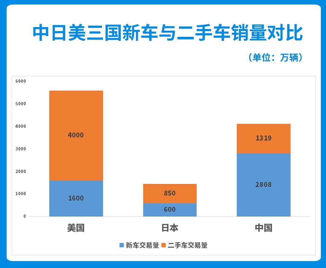 相关数据显示,在美国,二手车交易量基本是新车的2-3倍,在过去十年间,美国新车年均销售量约1600万辆,而二手车年平均销量约为4000万辆。而在邻国的日本,新车年平均销量约为600万辆,二手车年交易量也达850万辆,二手车是新车的1.4倍。