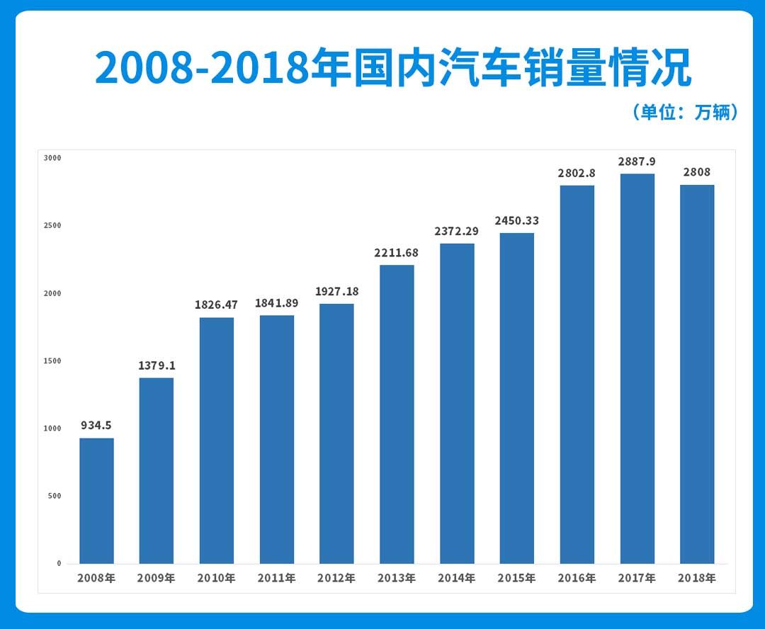 其实按照6年的换车周期,国内二手车市场理应在2015年左右迎来爆发,因为国内汽车真正大普及是从2009年刺激政策时开始的,新车年销量从2008年不到千万辆增长到2017年的2887.9万辆,之后市场趋于饱和,大部分的家庭已经拥有了车。