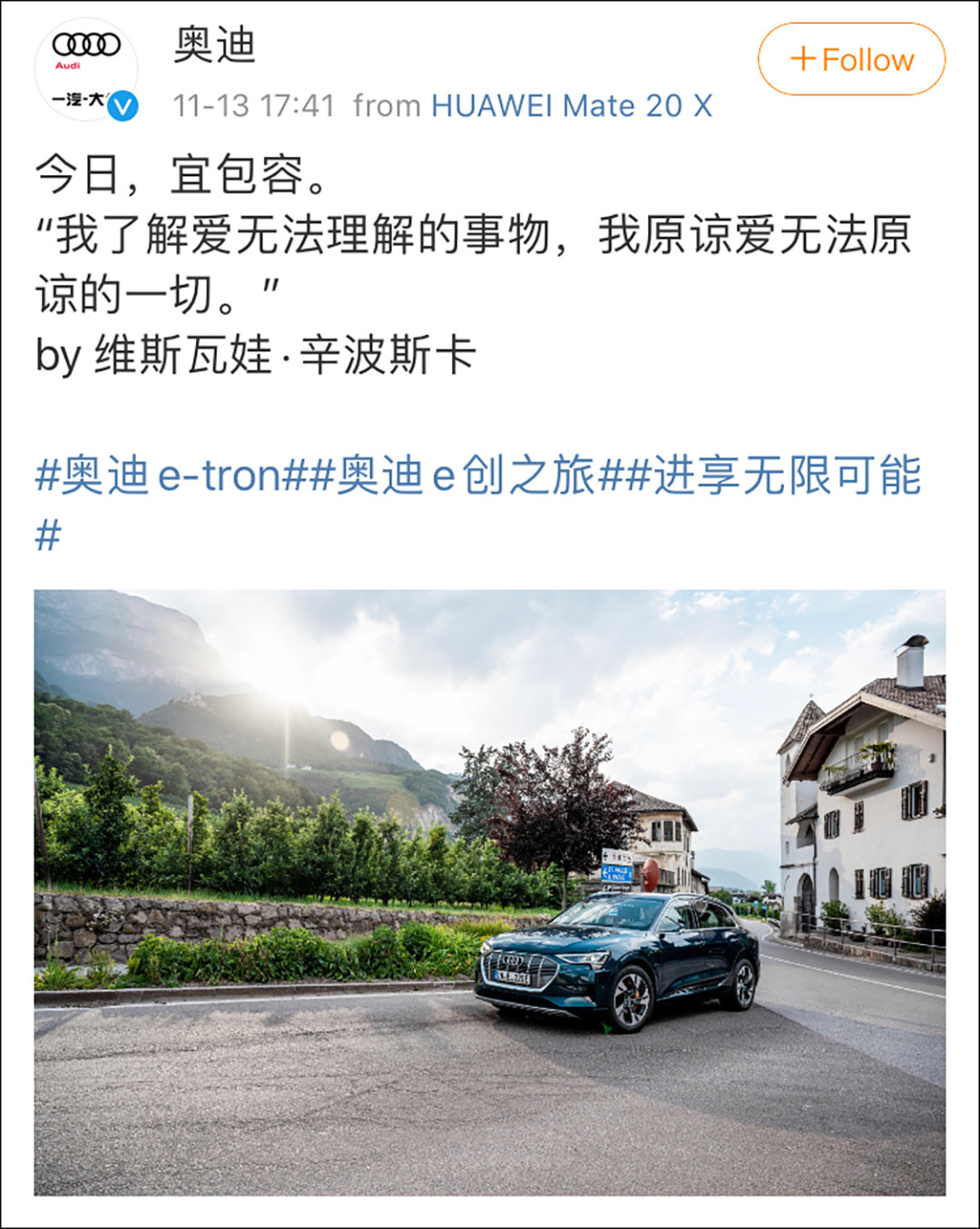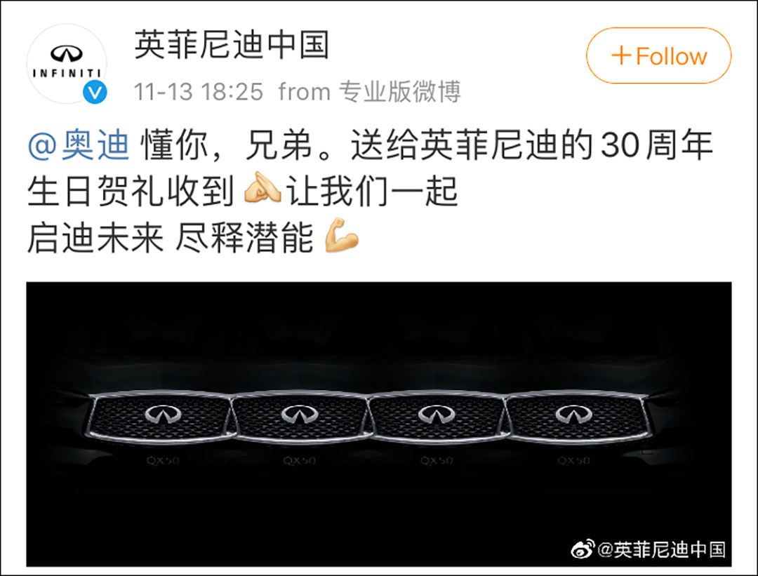 不过,令人意外的是,奥迪和英菲尼迪双方对此的态度却相当的微妙,在腾讯广告发布官方道歉信后,双迪也先后给出“今日,宜包容”、“懂你,兄弟”的表态,让原本的营销事故演变成双赢的“营销合作”。