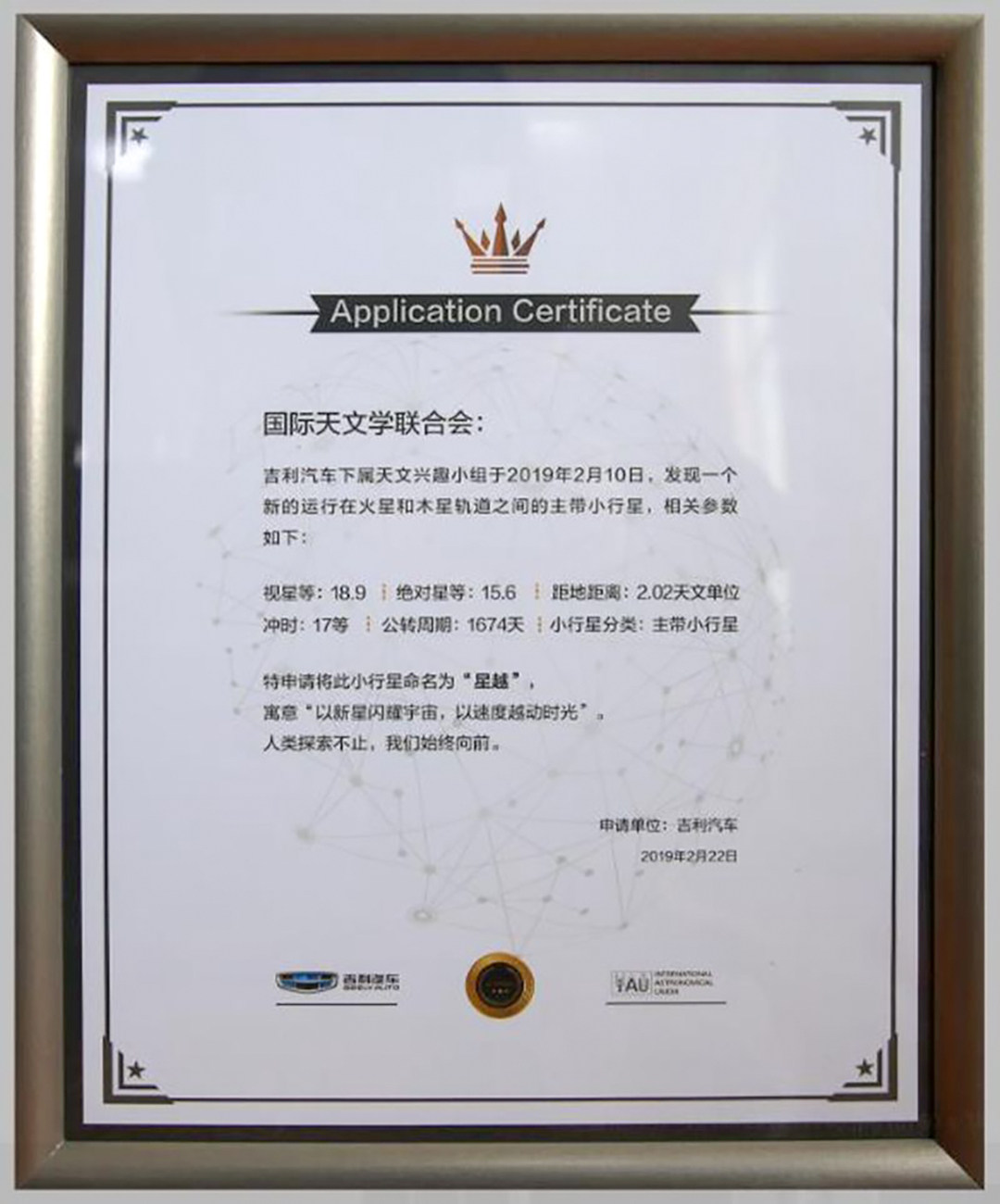 早期,吉利官微对此颗小行星的描述是极为详尽,称“经过长期观察,发现了火星以及木星轨道之间,有一颗围绕太阳运转的小行星,其公转周期1674天,距地球距离2.02天文单位”,同时公布了相关申请文件。