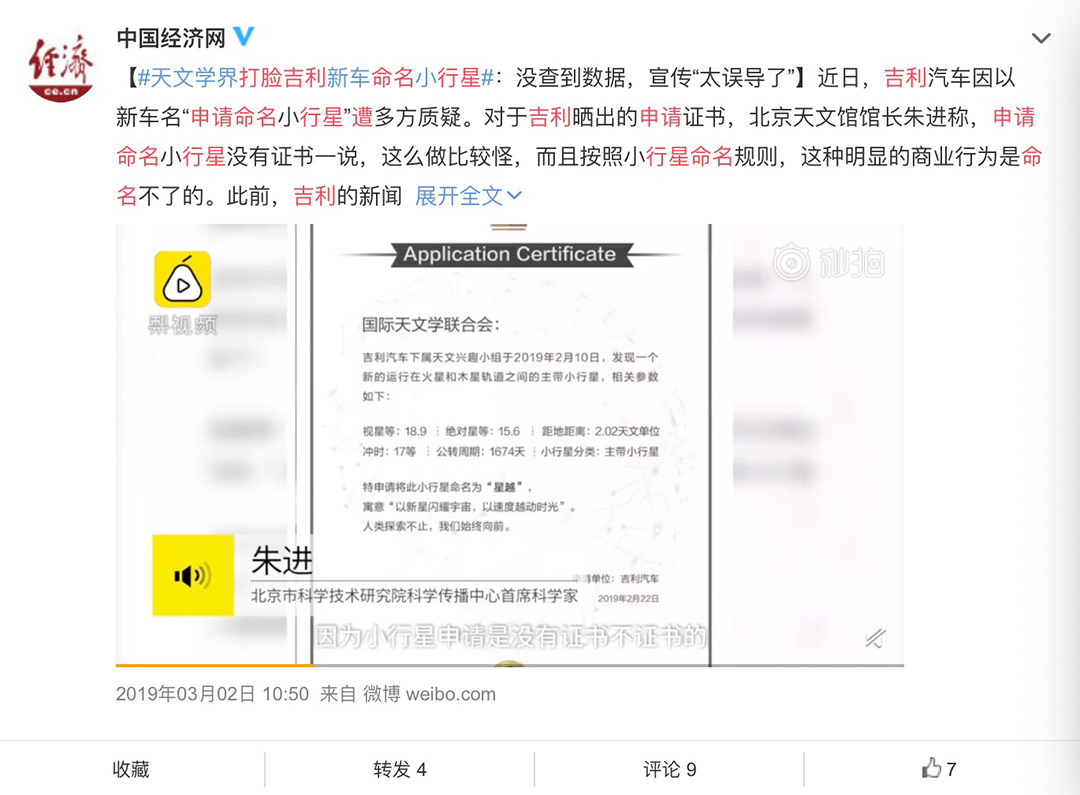 但北京天文馆馆长朱进称:小行星命名有些“不可能”;中科院云南天文台丽江天文观测站站长和寿圣也曾发微博专门声明:“吉利的活动我们丽江天文观测站只提供活动场地,小行星命名申请与我们无关......