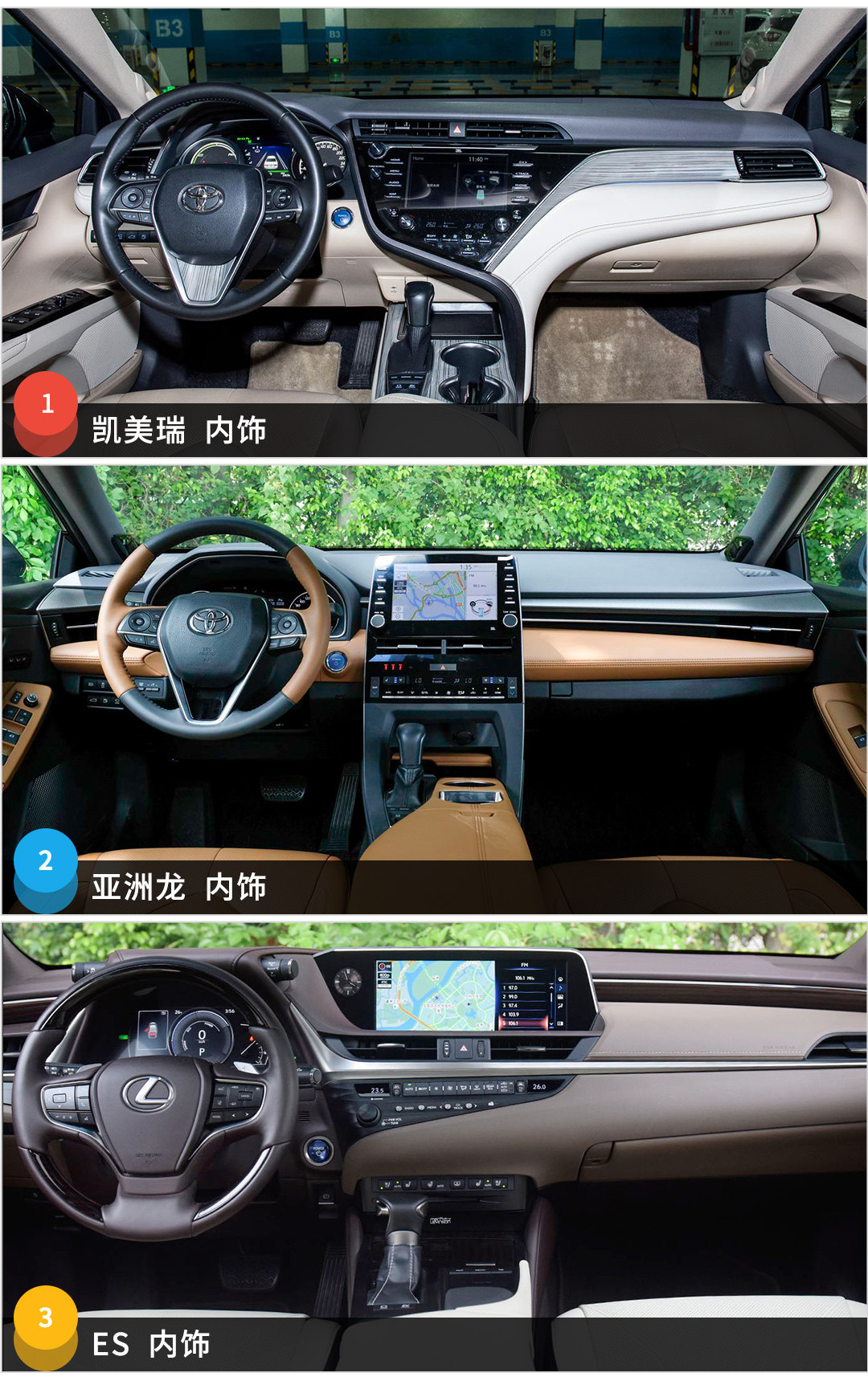 从外观上来看三款车型都各具特色,凯美瑞和ES都提供两种外观可供选择,运动版车型相对会更显年轻,而在混动版车型上三车均采用蓝色车标以示自己不一样的身份。综合来看,ES和亚洲龙的外观设计会更显大气沉稳,凯美瑞则相对更显年轻运动,至于如何选择那就要看个人的喜好了。