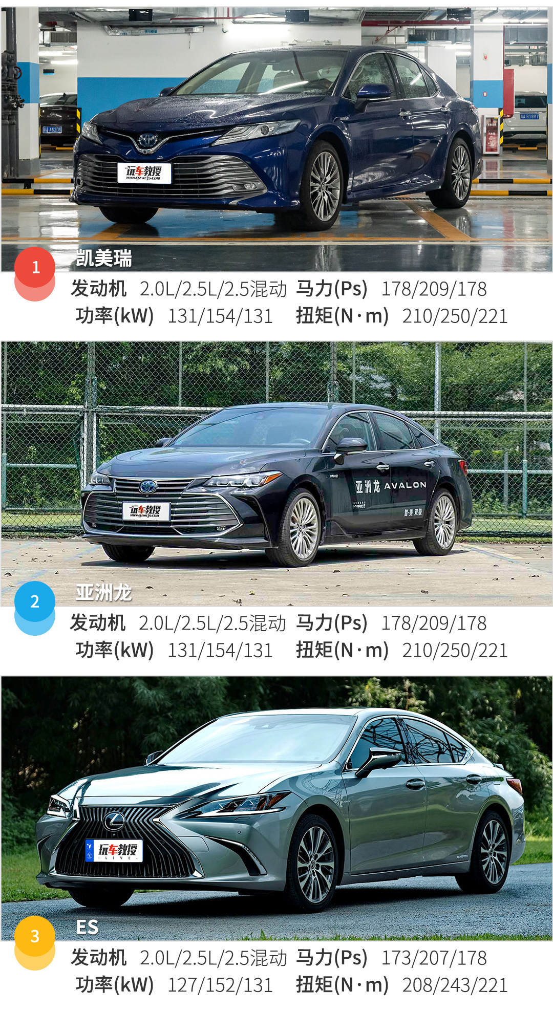 说到凯美瑞想必很多人都有听说过了,而至于亚洲龙那可能就相对陌生一点了,在此之前凯美瑞可以说是只有同级的对手,并没有来自自家的竞争,不过在亚洲龙出现之后凯美瑞一直受到不小的压力。但是当你细心观察,你会发现他们顶配车型的价格又能买到更上一级的雷克萨斯ES车型了,30万不到的售价就能买到一辆中大型车,对于不少人来说都是一个不小的诱惑。那么今天我们就来说说三款价格相近的车型,哪一款更值得入手呢?