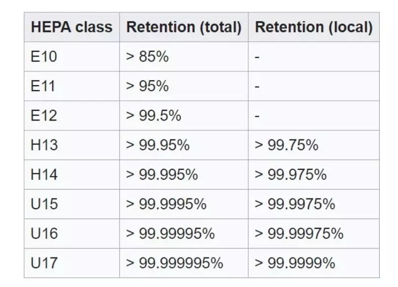 不过HEPA滤芯的过滤效果也有优劣之分。具体过滤效果可以参考上图,举个例子95%的E11级别就相当于N95口罩。