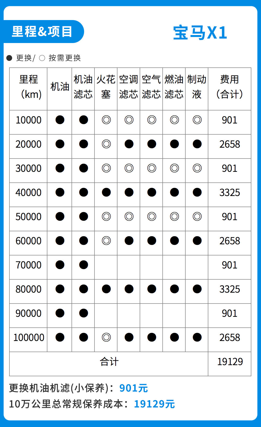 宝马X1 1.5T(以下简称宝马X1)的保养周期也为10000公里,但首保并不免费,小保的费用为901元,大保费用为2658元,10万公里总的保养费用为19129元,每年平均约3826元。