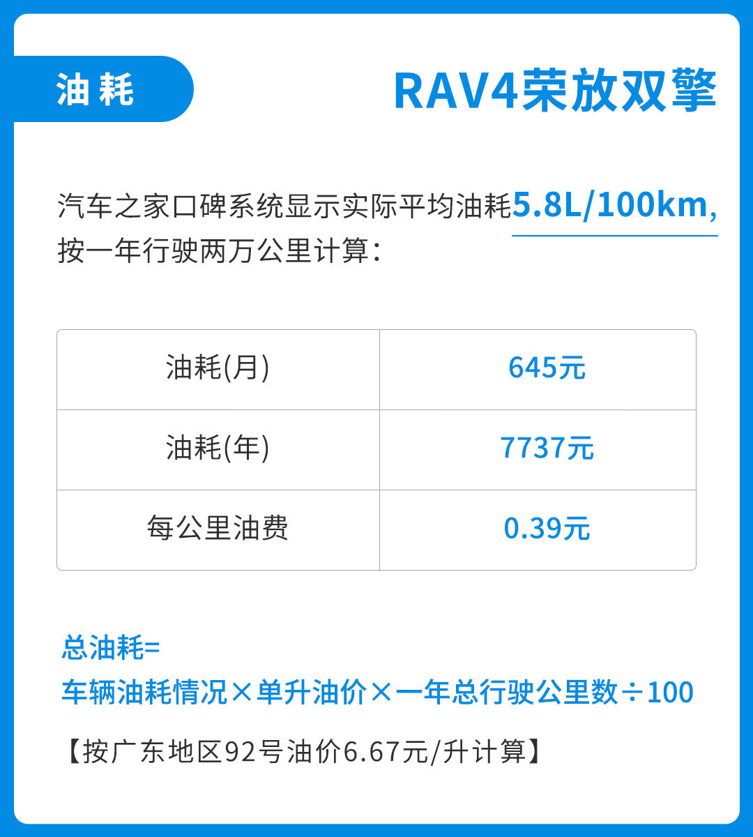 因为搭载了混动系统,所以RAV4荣放的油耗较低,我们在汽车之家车主口碑处了解到,车主的平均油耗为5.8L/100km,并且加92号汽油,按1年行驶2万公里计算,一年的油费约为7737元,5年的总油费为38685元。