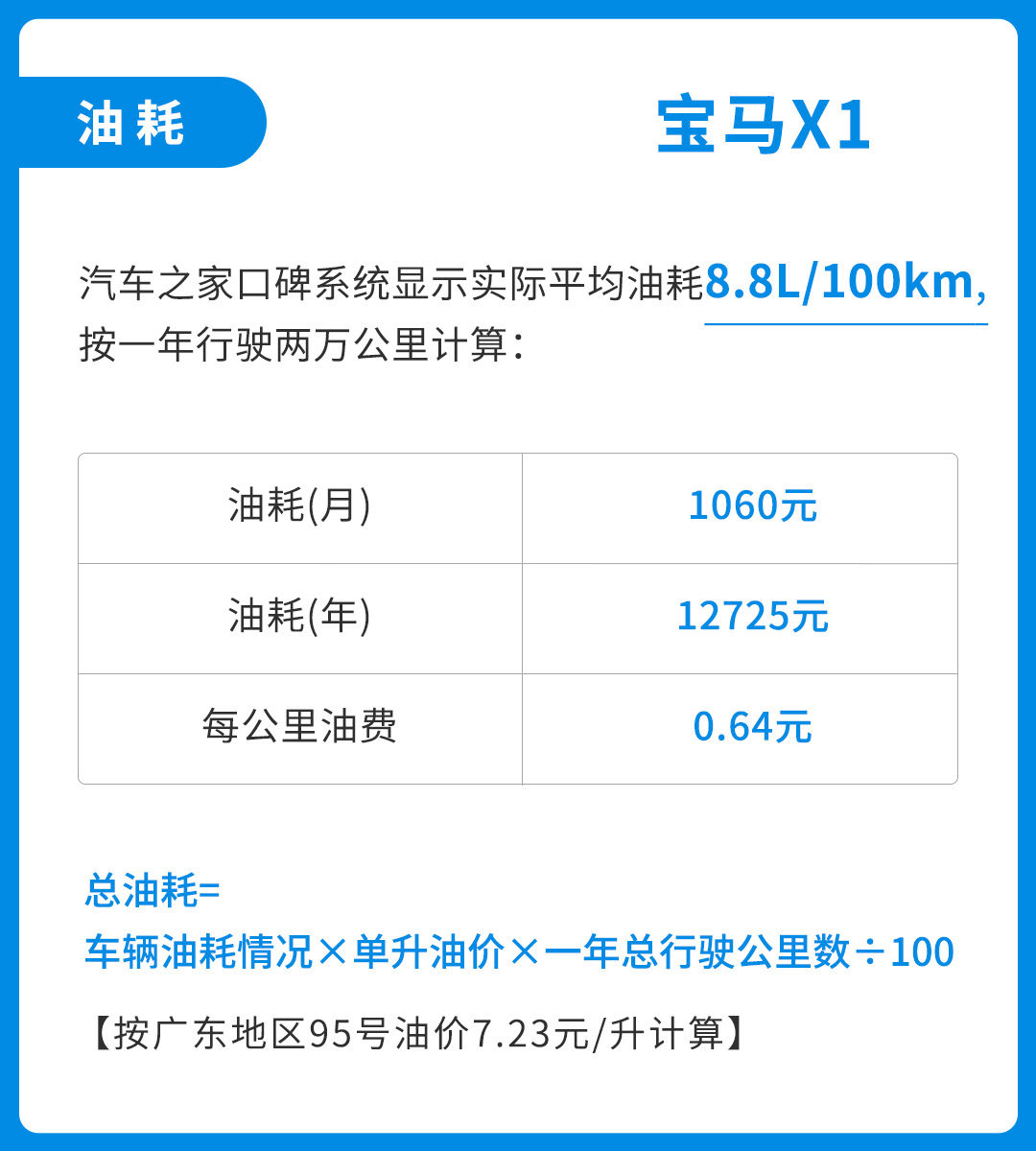 宝马X1车型相对RAV4荣放更耗油,在汽车之家车主口碑上,车主的平均油耗为8.8L/100km,而且加95号汽油,按1年行驶2万公里计算,一年的油费约为12725元,5年的总油费为63625元。