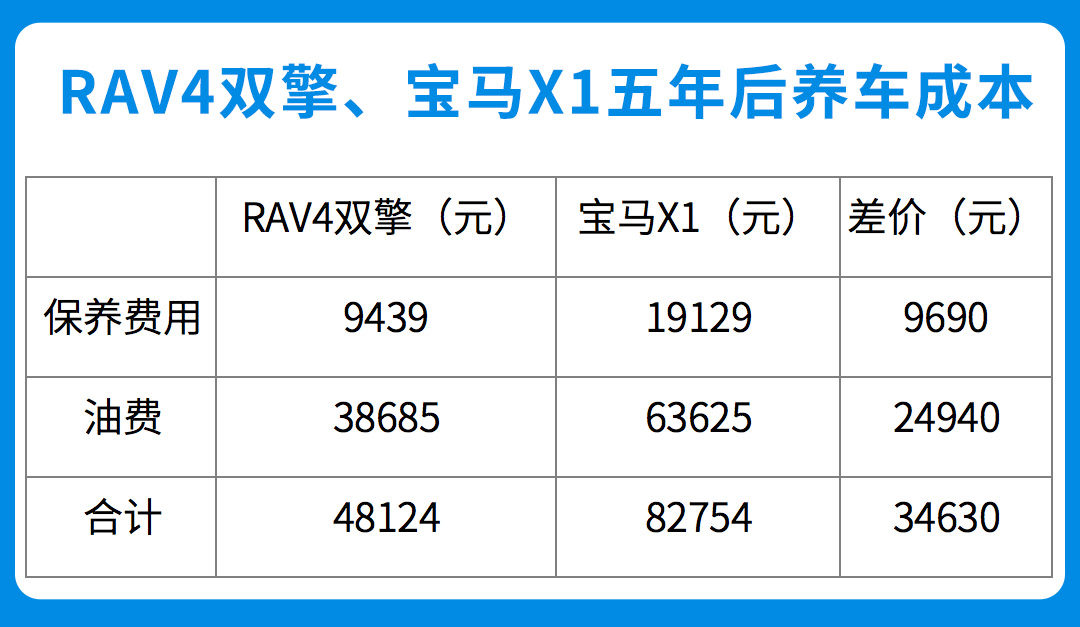 综上来看,在后期的用车成本中,RAV4荣放主要在保养和油耗方面比宝马X1便宜,5年后前者比后者节省约34630元。