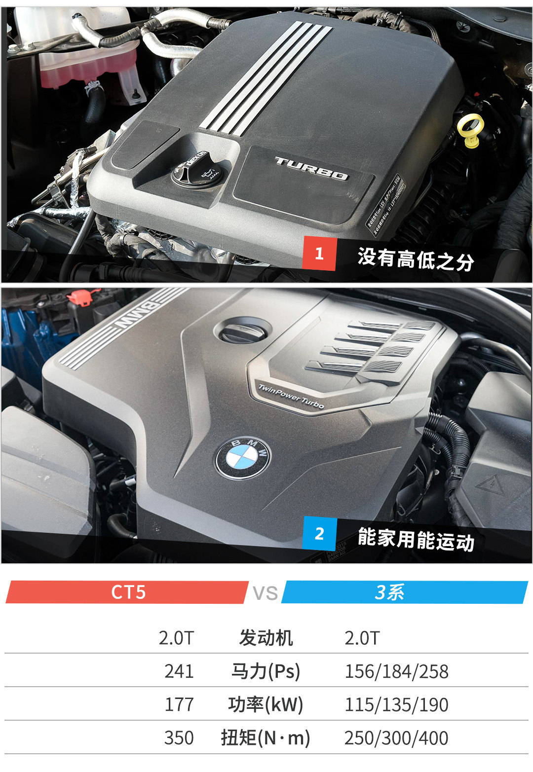 既然两台车都说自己很运动,那我们就先来看看账面数据。从图中可以看出,CT5全系提供一款241匹的2.0T智能变缸发动机,可以说的兼顾了动力和油耗两方面;而在3系上同样也是全系提供了2.0T发动机,不过共分为3个版本;在变速箱方面CT5匹配的是自家的10AT变速箱,而3系则是ZF的8AT变速箱,对于燃油经济性上CT5相对会更胜一筹。