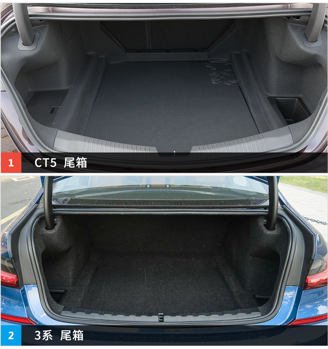 再来看看尾箱方面的空间,可以看出3系尾箱的宽度是要宽于CT5的尾箱,而在两侧都配有储物格,这一点还是做得比较好的,不过,3系的后排并不能放倒,而CT5则可以通过放倒后排后拓展尾箱的空间,进一步提高空间的使用率。