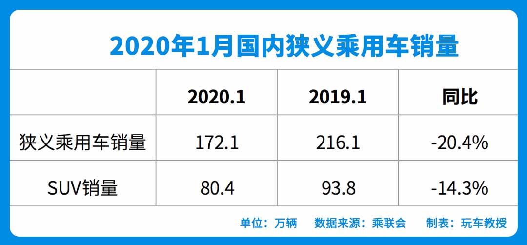 初看今年1月份国内狭义乘用车市场销量“惨淡”,同比20.4%的跌幅可谓罕见,但也不必过于担忧,毕竟受春节假期的影响,1月份的有效销售仅有20天左右,比往年减少了约30%,而且1月末突然爆发的新型冠状病毒对销量也造成了一定影响。