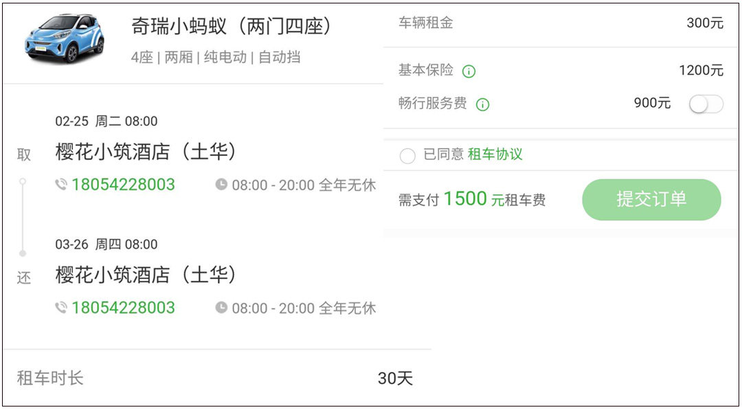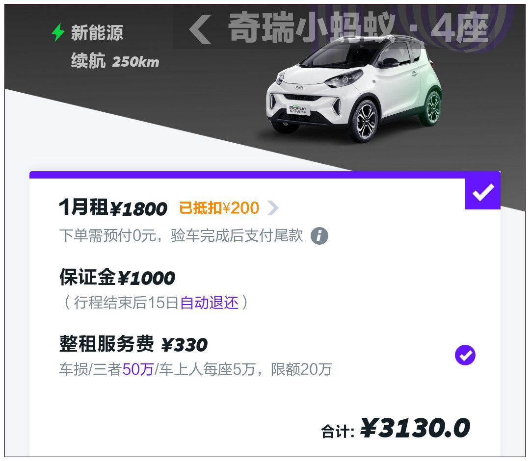 同样是奇瑞小蚂蚁,EVCARD上的月租金仅为1500元(300元租金+1200元保险费),此外由于是短租车型,还要交1000元押金解锁车辆。如果你只租一个月,EVCARD这个平台要更加省钱,如果租两个月以上,那就选择GoFun吧。