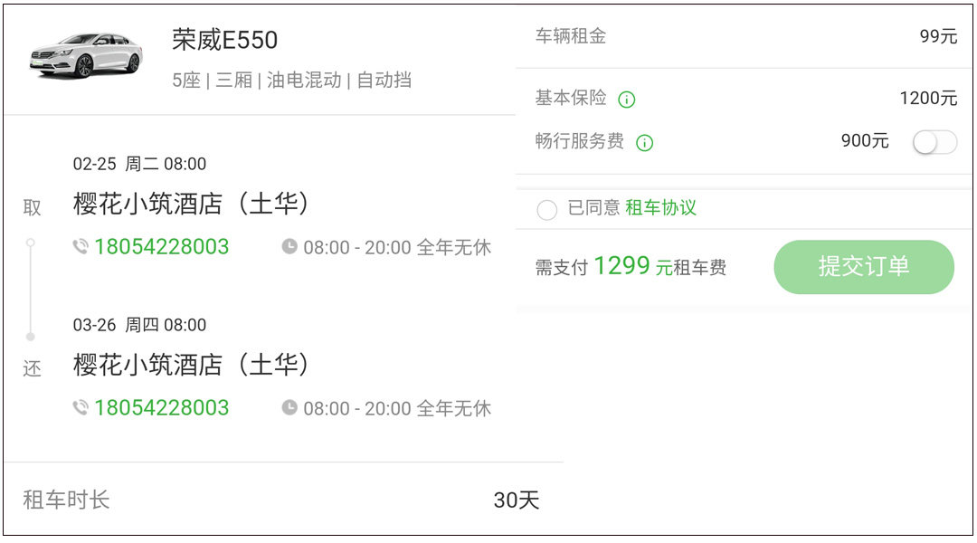 其实还有更便宜的选择,那就是租一辆荣威E550,月租金仅为1299元(99元租金+1200元保险费)。不过荣威E550作为一辆油电混动车型,它的油耗不算低,燃油这部分费用要考虑进来。除了租金低外,荣威E550的空间也比小蚂蚁大很多,大家各取所需吧。