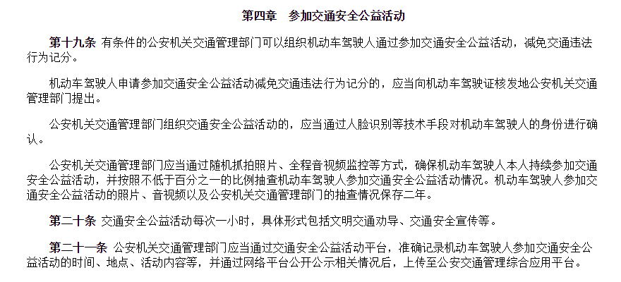 不想接受形式较为“古板”的传统考试,也可以选择参加交通安全公益活动,减免交通违法行为记分。同样的,公安机关交通管理部门会通过随机抓拍照片、全程音视频监控等方式,确保机动车驾驶人本人持续参加交通安全公益活动,并按照不低于百分之一的比例抽查机动车驾驶人参加交通安全公益活动情况。交通安全公益活动每次一小时,具体形式包括文明交通劝导、交通安全宣传等。