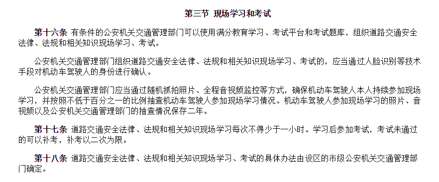 至于现场学习,公安机关交通管理部门会通过随机抓拍照片、全程音视频监控等方式,确保机动车驾驶人本人持续参加现场学习,并按照不低于百分之一的比例抽查机动车驾驶人参加现场学习情况。学习时长不得少于一小时,学习后参加考试,考试未通过的可以补考,补考以二次为限。