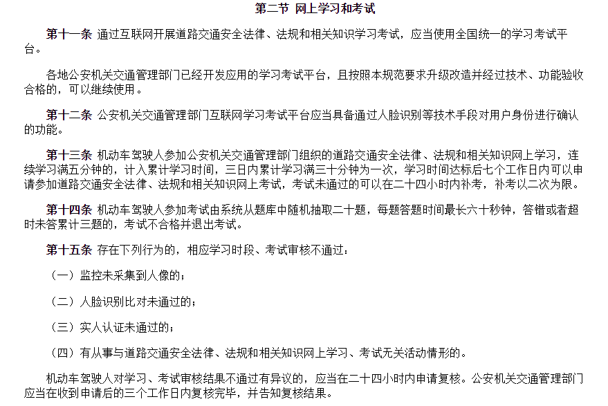 对于学习的内容就完全与考试的内容保持一致。形式包括网上学习、现场学习、参加交通安全公益活动。对于选择网上学习的车主而言,就要按规定进行网上学习,在相应学习时段或考试审核期间,存在监控未采集到人像、人脸识别比对未通过、实人认证未通过等行为,一律判定为不通过。