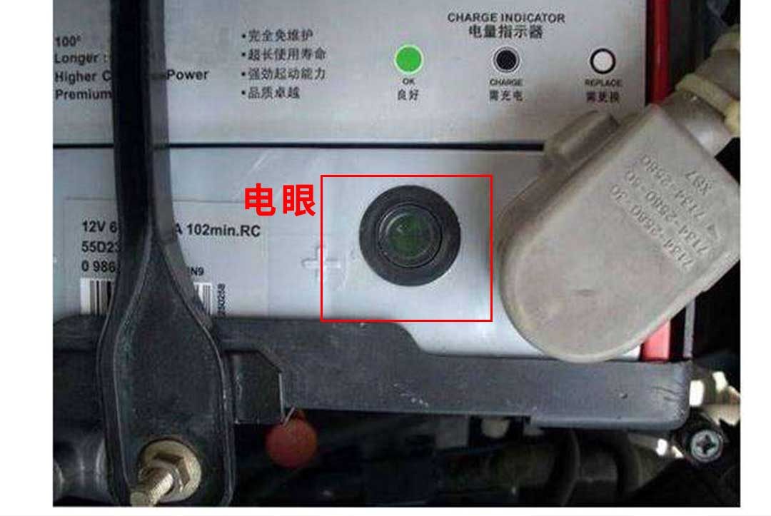 汽车电瓶一般都有一个观察孔,也叫"电眼"。不同品牌电瓶的电眼颜色可能不一样,常见的用绿色、黑色和白色三种颜色,其中绿色代表电量充足,黑色代表略微亏电,白色则代表快报废了需要更换。