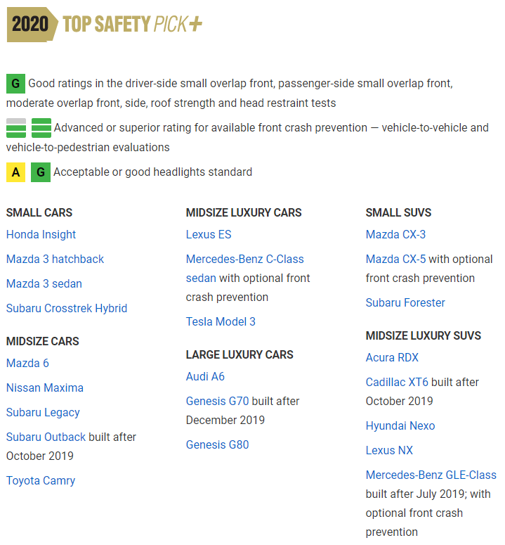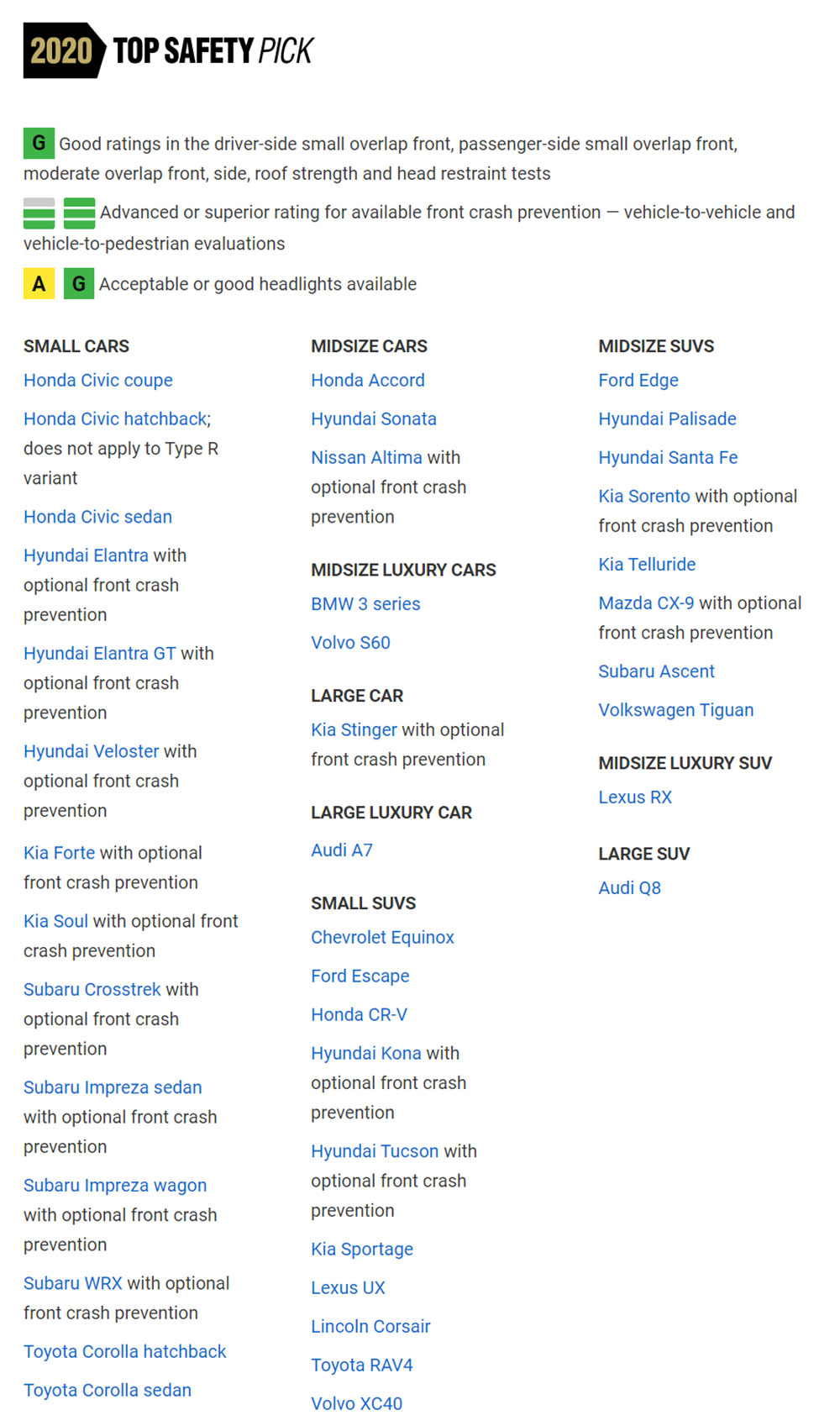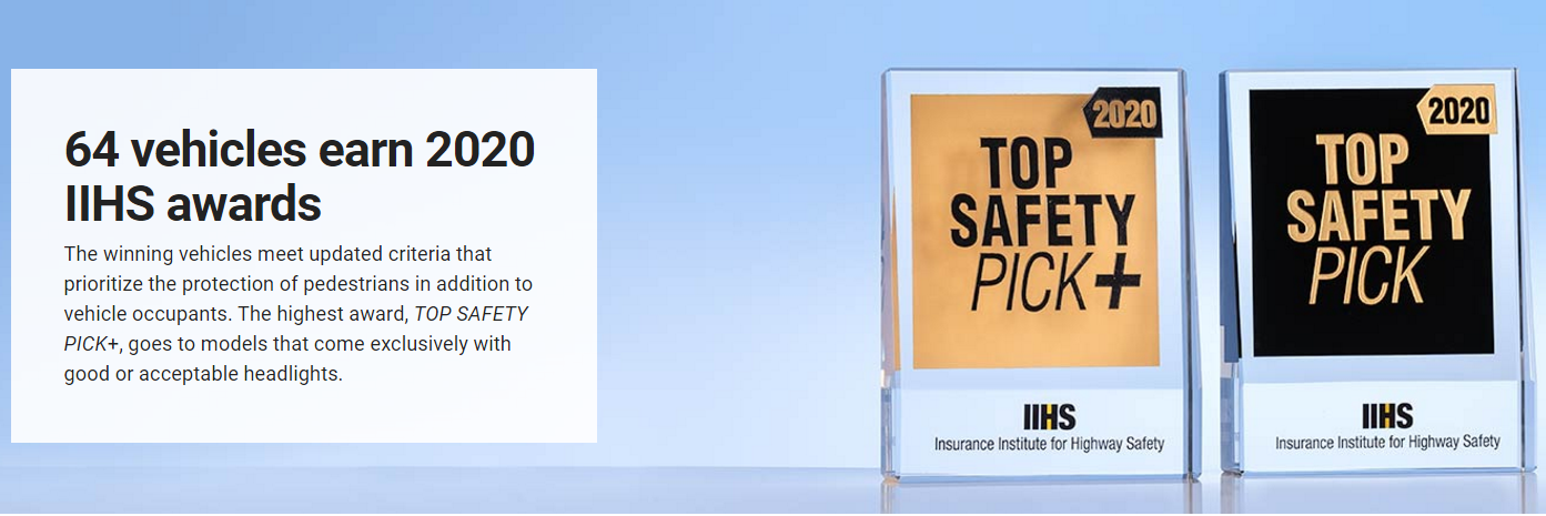 2020年IIHS对于TOP SAFETY PICK(顶级安全)和TOP SAFETY PICK+(顶级安全+)奖项的评定更为严苛,除了要求相关车辆必须在研究所的六项(驾驶席/副驾驶席小角度碰撞、正面/侧面碰撞、车顶强度、头部强度测试均)具有G(良好)评级以外,还需要提供性能良好的前照灯,以及有效避免车对车、车对人的自动紧急制动系统。
