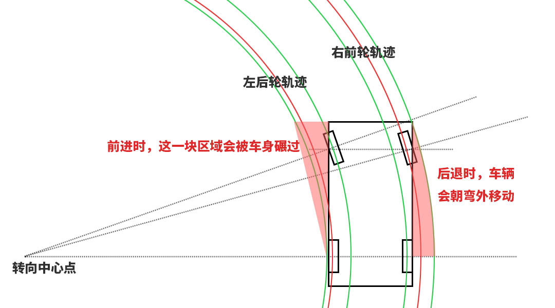 简单来说,我们向前行驶时,只需要看车头以及弯心侧车身侧面;当我们向后行驶时,只需要看车尾以及弯外侧车身侧面。