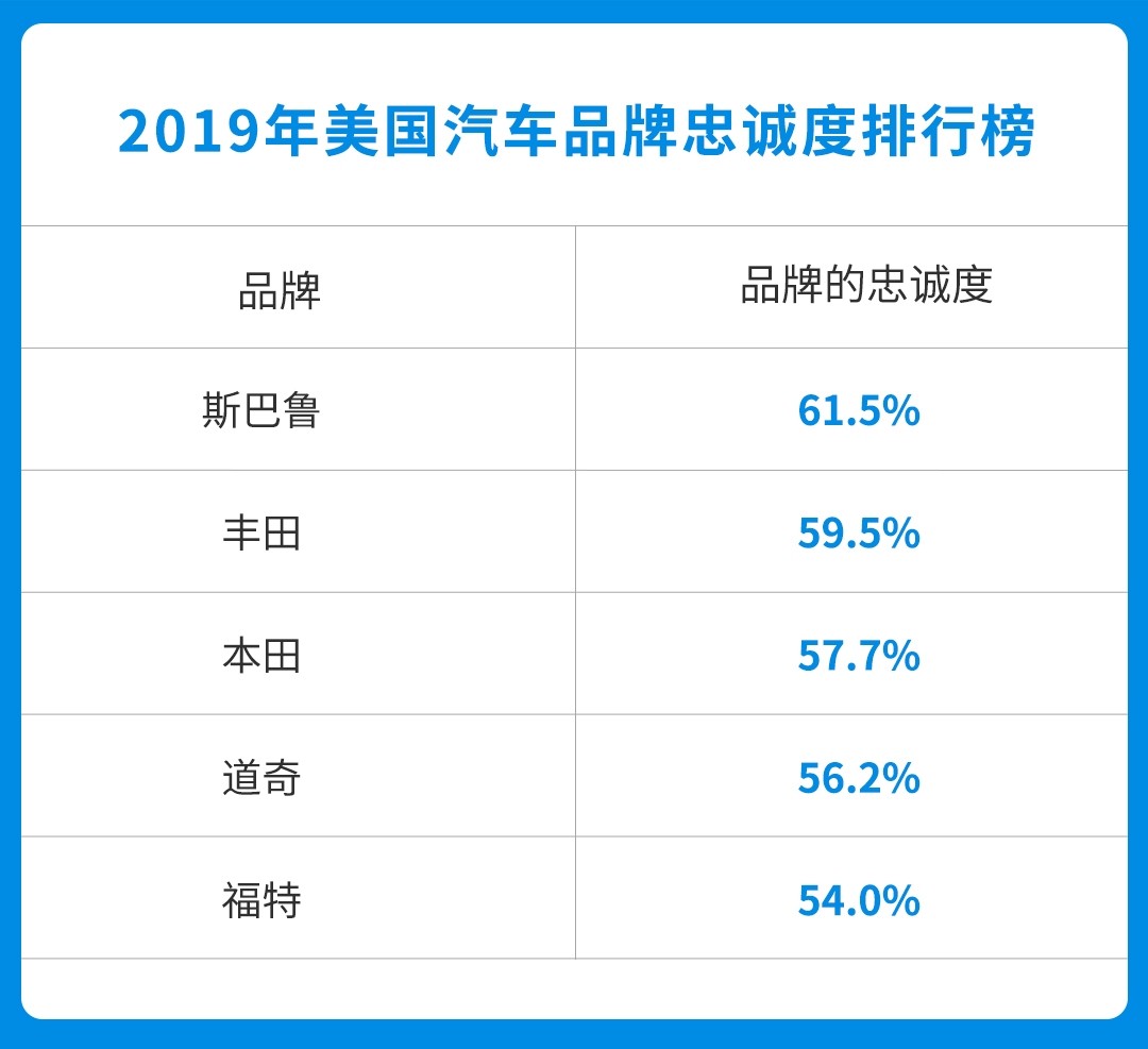 在消费者信赖度方面,丰田和本田无论是美国还是中国都是榜上有名,但美国市场对于一般品牌忠诚度最高的竟然是斯巴鲁,而在国内市场,斯巴鲁旗下车型售价较高且养护成本偏高,算是一个比较冷门的品牌。加上美国那边福特和道奇作为本土品牌,地方策略和投放车型的不同,也导致了这两个品牌的市场表现与国内市场有很大不同。
