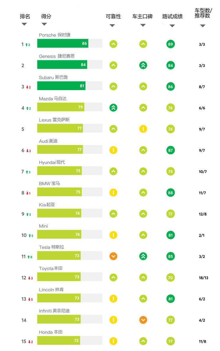 从榜单可以看出,排名靠前的有专注操控的品牌马自达和斯巴鲁,也有操控出色的豪华品牌特斯拉和保时捷,可见美国的消费者对于操控特别看重。除了操控之外,在榜单中豪华车的占比也非常高,可见豪华车的受欢迎程度在美国地区也非常高。