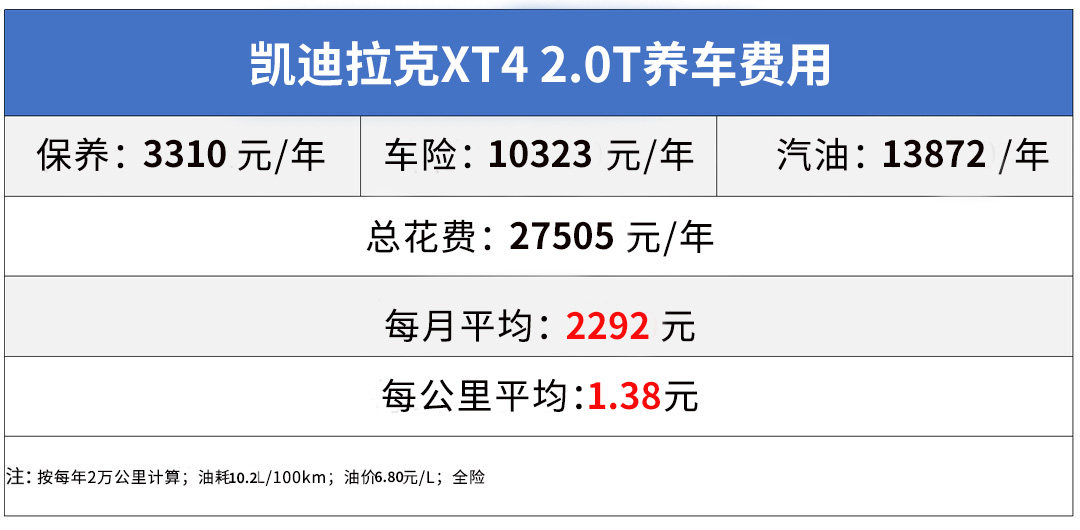 如果算一下XT4的养车费用,就知道为什么有人望而却步了。排量大则油耗高,XT4的综合油耗已经去到10.2L/100km了。非但如此,豪车的保险费用也要贵很多,这样算下来紧凑型豪华SUV的养车费用就比普通合资紧凑型SUV贵了5000元以上。