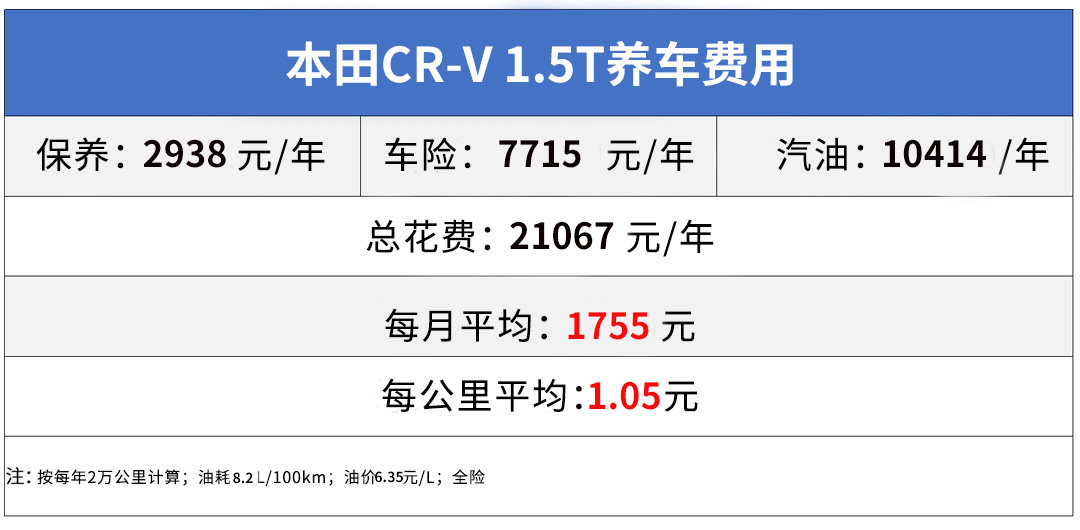 那么一辆CR-V的养车费用如何呢?通过表格可以看到CR-V一年的养车费用为21067元,虽然油耗低了,但保养和保险的价格增加了,所以总体上看CR-V的价格比长安CS75高那么一点。