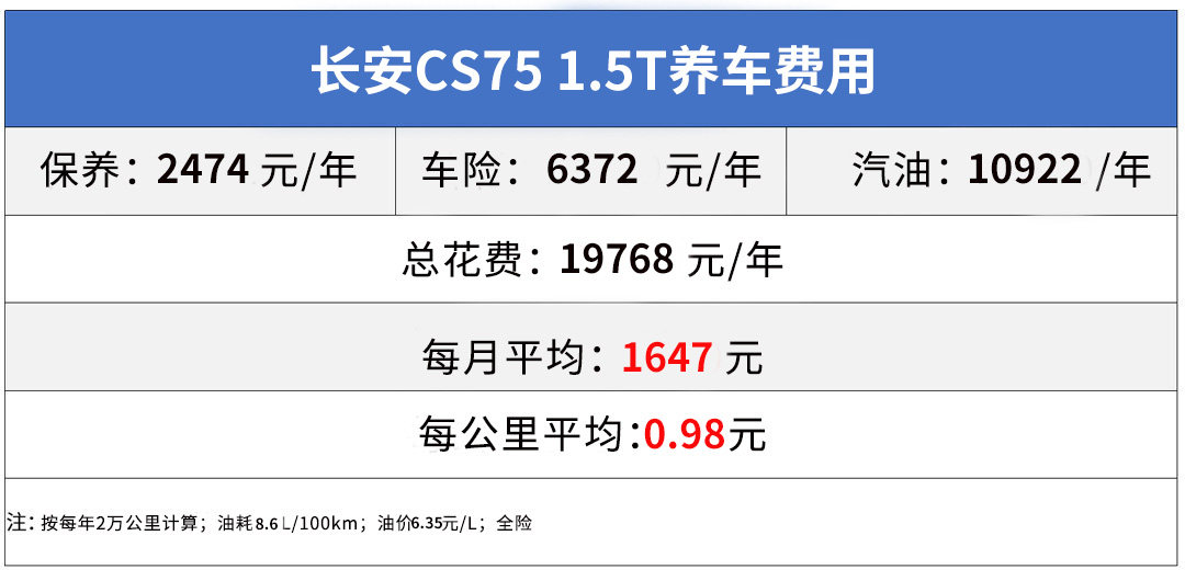 以相对划算的价格买回家,CS75后期的养车费用如何?目前油价处于暴跌状态,所以价格会相对便宜。以CS75 8.6L的百公里综合油耗来看,它一年的油费也要10922元了,不算高。第一年买全险,价格会高一点,第二年会逐渐降低。