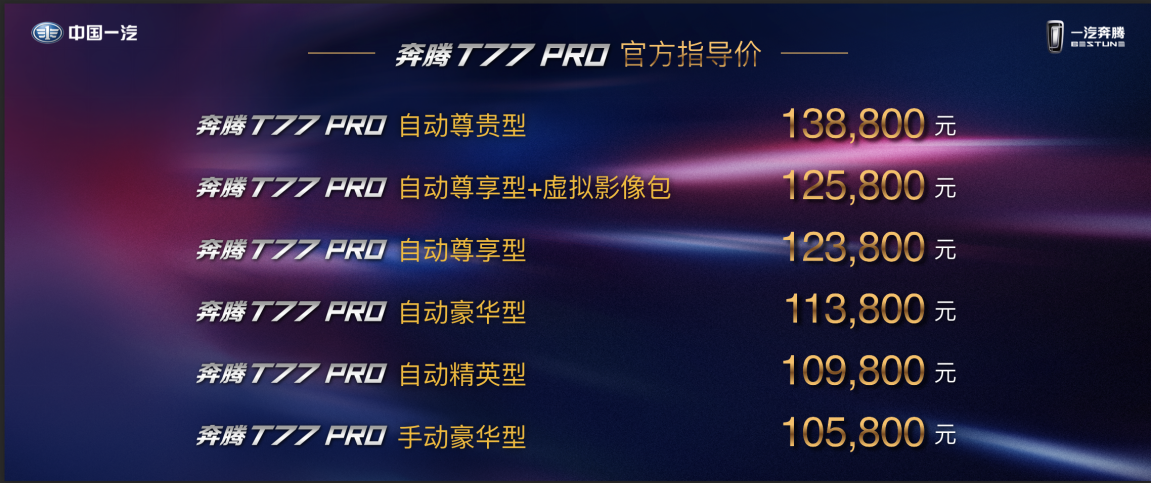 奔腾T77 PRO自动尊享型+虚拟影像包 125,800元;