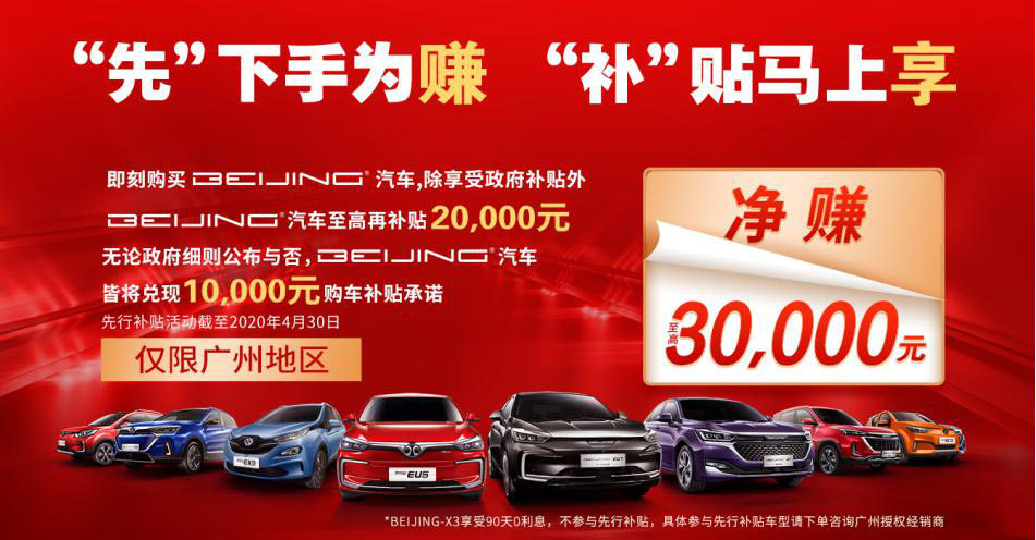 3月3日,广州市发布《坚决打赢新冠肺炎疫情防控阻击战努力实现全年经济社会发展目标任务的若干措施的通知》,其中明确,2020年3月至12月底,在使用环节对个人消费者购买新能源汽车给予每车1万元综合性补贴。与此同时,BEIJING汽车也推出了针对广州市的专项购车政策,“先”下手就赚,“补”贴马上享——购BEIJING汽车旗下6款热销纯电动车型,最高可享3万元购车优惠,为待购的意向客户提供了绝佳购车良机。