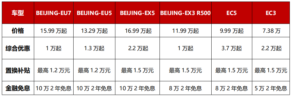 本次优惠活动涵盖BEIJING汽车旗下EU7、EU5、EX5、EX3、EC5、EC3六款新能源精品车型,满足用户多元化、高品质的用车需求。