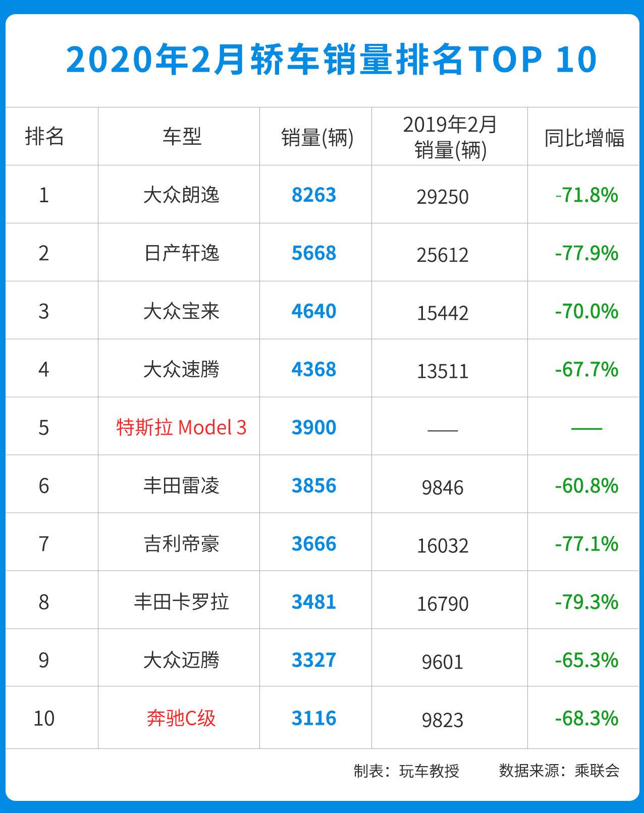 就在3月10日,乘联会公布了2月份国内的汽车销量数据以及各类车型的销量榜单。从乘联会公布的信息上获悉,2月份国内狭义乘用车市场销量达25万辆,同比下降78.7%,环比下降85.4%;1-2月累计销量196.9万辆,同比下降41.0%。其中,2月份轿车销量12.6万辆,同比下降78.0%,环比下降84.5%;累计销量94.5万辆,同比下降42.6%,轿车车型具体排名如下: