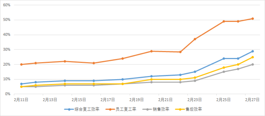 就复工的情况来看,截止2月24日,中国汽车流通协会按经销商复工调研的范围和样本,对会员单位及相关企业的复工情况做出了调研,涵盖74家汽车经销商集团,涉及4S店共计4702家,综合复工效率14.83%,其中,员工复工率37.2%,销售效率8.0%,售后效率10.5%。