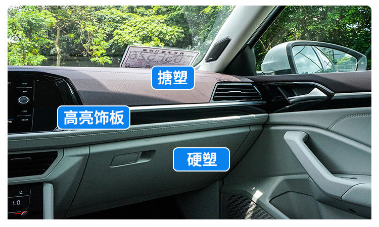 再者,就算同样是用硬塑料,由于不同品牌之间的做出来的效果都不一样,包括摸上去的手感、色泽、厚重感都不一样,举个例子大众的速腾,就算黑色硬塑料部分的纹理都很细腻,饱满,有一种皮革的感觉。