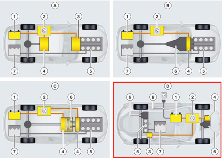 新能源的驱动结构大致分为3类(见上图),A代表串联也就是增程式电动车(宝马i3),B代表并联也就是插电混动(530le),C代表混联也叫功率分流(第一代宝马X6混动)。D严格意义上说不是混动结构,而是一种四驱结构,业内叫分轴四驱,比如宝马i8。