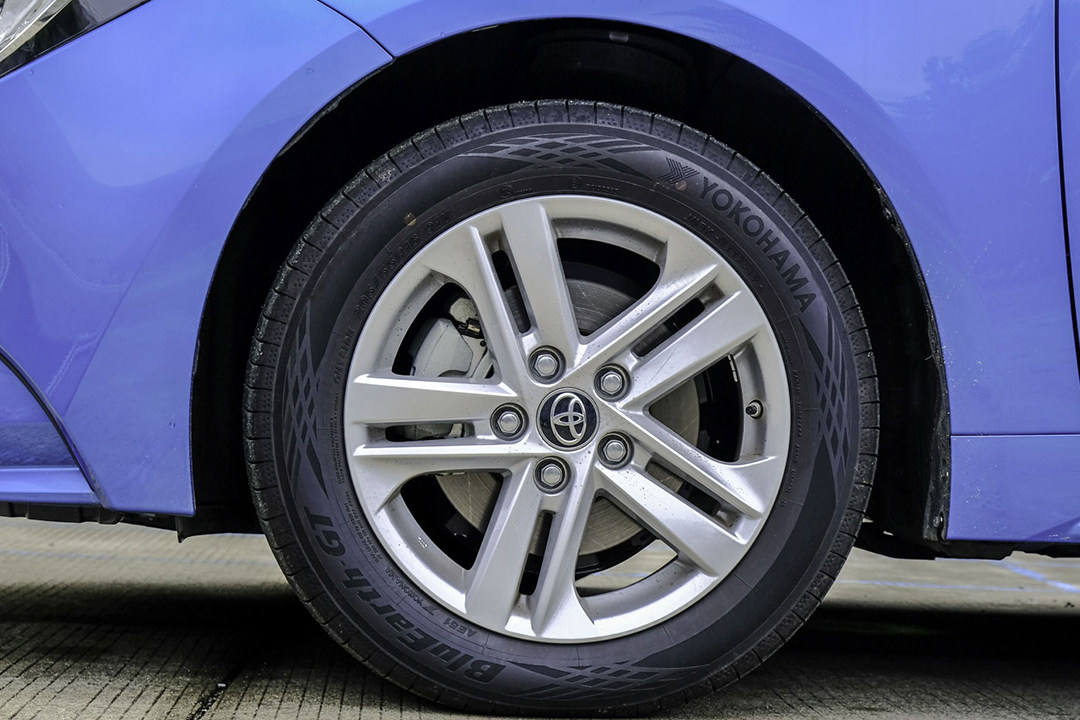 丰田雷凌双擎原厂选用的横滨 BluEarth系列轮胎强调静音舒适性表现,并通过采用胎面两侧的“空气动力学设计”以及胎面胶轻量化处理等实现降低降低油耗的效果,而激烈驾驶时的抓地性能则不是它的强项。