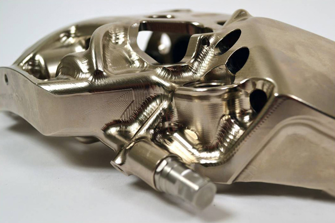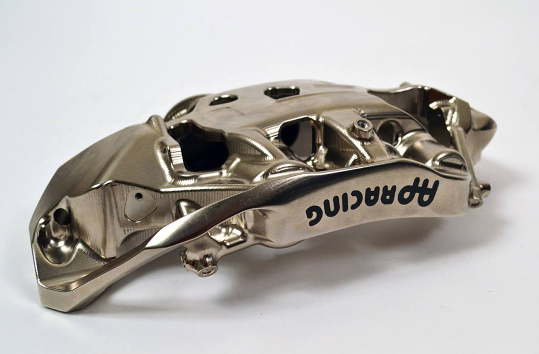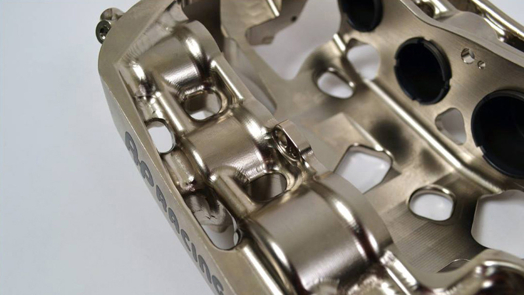 偷轻的同时还需要考虑强度,要知道刹车的工作就是通过刹车油推动活塞,从而夹紧刹车盘,将车辆的动能转化为热能,再将热能散发到空气中,实现减速的目的。在活塞挤压刹车盘的同时,刹车盘也会对活塞有反作用力,特别是在赛场上高强度的使用,会进一步将此影响扩大,而AP使用一体成型来解决该问题。