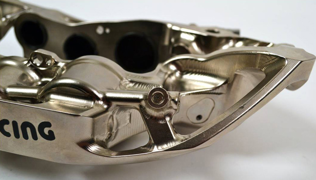 一体式卡钳也分铸造和CNC式(Billet),最大的区别就是重量,基本上CNC机床制造出来的卡钳只有铸造的二分之一到三分之一的重量,对于汽车的簧下质量来说,显而易见。