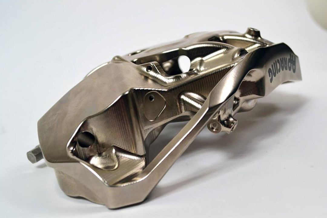 AP Racing CP6169整个卡钳呈现金属颜色并辅以镀铬降低卡钳由于刹车粉尘以及雨水等侵蚀,而卡钳本身为CNC一体式成形,简单来说,就是通过机床将一块铝块用刀铣得,我们还可以从图片中看到CNC机床独有的刀痕。