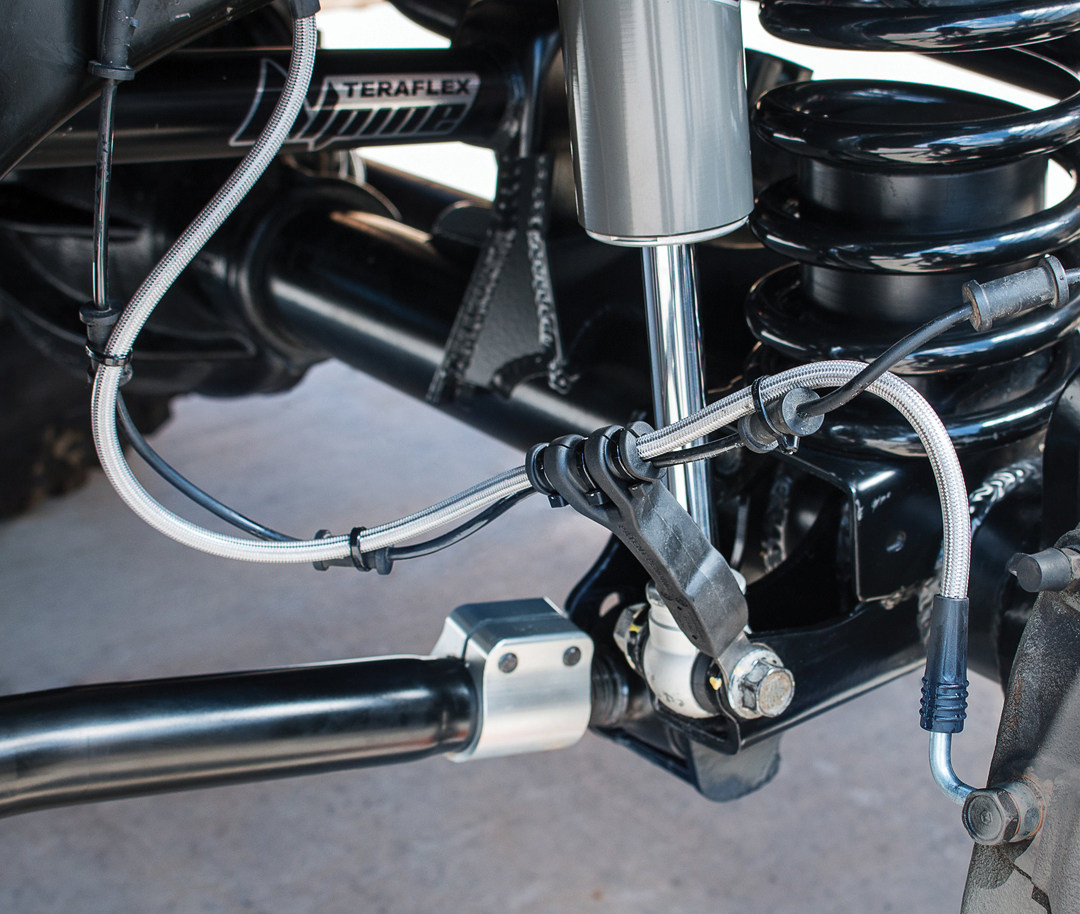 刹车钢喉,普通刹车油管是橡胶材质,在踩刹车的时候,刹车总泵推动刹车油到分泵之前,由于橡胶管有伸缩特性,会影响刹车力的传递,从而造成“刹车软”的现象。更换刹车钢喉是能够解决由于刹车油管膨胀导致的刹车力不足问题,刹车钢喉在橡胶管的外面包裹着一层钢丝,由于金属的变形量小,所以更能将刹车力集中在分泵上,自然刹车性能也更好,但也是由于金属原因,刹车钢喉不能长时间弯折,否则包裹在外面的钢丝会断裂,所以厂家为了增加车辆的耐用程度,使用普通橡胶管作为刹车油管。
