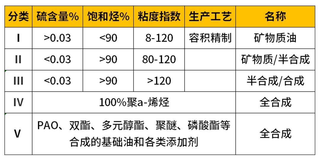 早在1919年,美国就成立了为基础油制定标准的组织——美国石油协会(American Petroleum Institute),简称API,该组织有近400家从事石油勘探和生产、运输、炼油和销售的公司组成,目标就是制定协调石油行业标准,规范成品油的质量,他们将机油的基础油五大类。