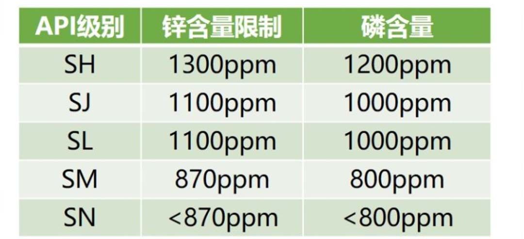 汽油发动机机油共分为12个质量等级,依次由SA至SN,字母靠后,质量等级越高,其中,区分各个级别重要指标就是锌和磷的含量,对这两种元素的限制,是为了通过减少汽车尾气中重金属含量,降低PM2.5带来的污染。