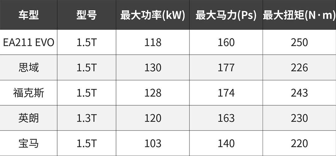 从上图可见,这款发动机在功率方面基本上是处于“完败”的,让人意外的是,这款发动机在数据上的表现竟然是要优于宝马的1.5T发动机,即使是用现款的1.4T去对比也是同样如此的。
