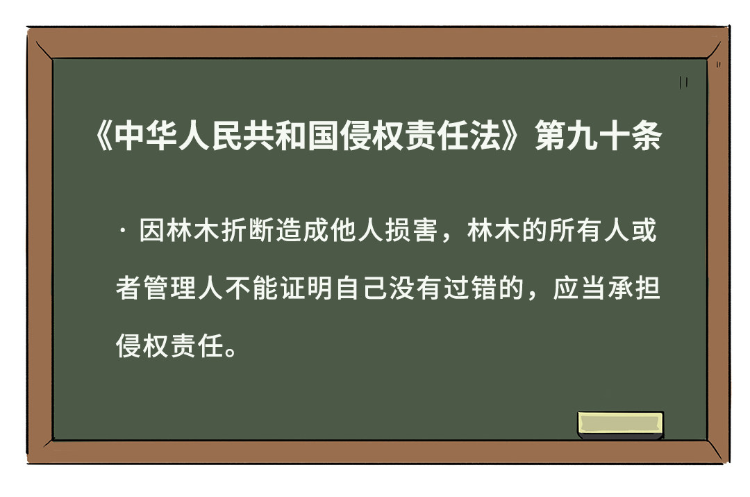 根据《中华人民共和国侵权责任法》第九十条规定:因林木折断造成他人损害,林木的所有人或者管理人不能证明自己没有过错的,应当承担侵权责任。
