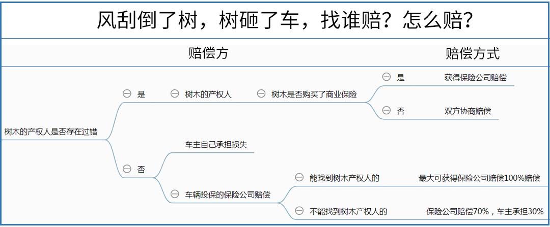 经过我们的梳理发现,风刮倒了树,树砸中了车,赔偿方主要有三类,分别为树木的产权人、车主本人和车辆投保的保险公司。如果树木的产权人存在过错,那么就可以找树木的产权人赔偿,否则就需要车主本人承担损失或者找车辆投保的保险公司赔偿。