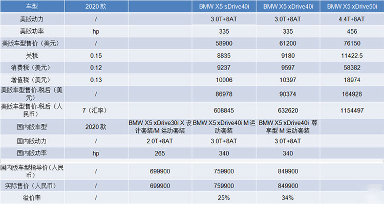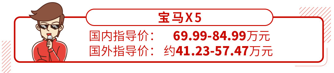 值得一提的是,作为国内平行进口车里的主力车型,宝马X5在海外售价也要比国内低得多。根据美国新车报价网edmunds数据显示,宝马X5售价5.89-8.21万美元,折合人民币约41.23-57.47万元,比国内便宜将近30万元。