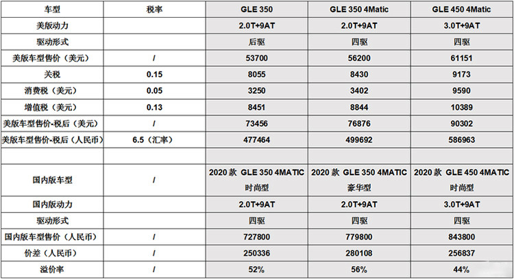 目前,国内GLE车型起步售价在70万元左右,而海外版本起步价仅37万元上下,两者价格相差值可以达到80多万元,这价格溢价率平均水平在50%以上。如果按照美国市场价格算,相当于在中国买一辆奔驰GLE的钱,可以在美国市场买到两辆一模一样的车子。