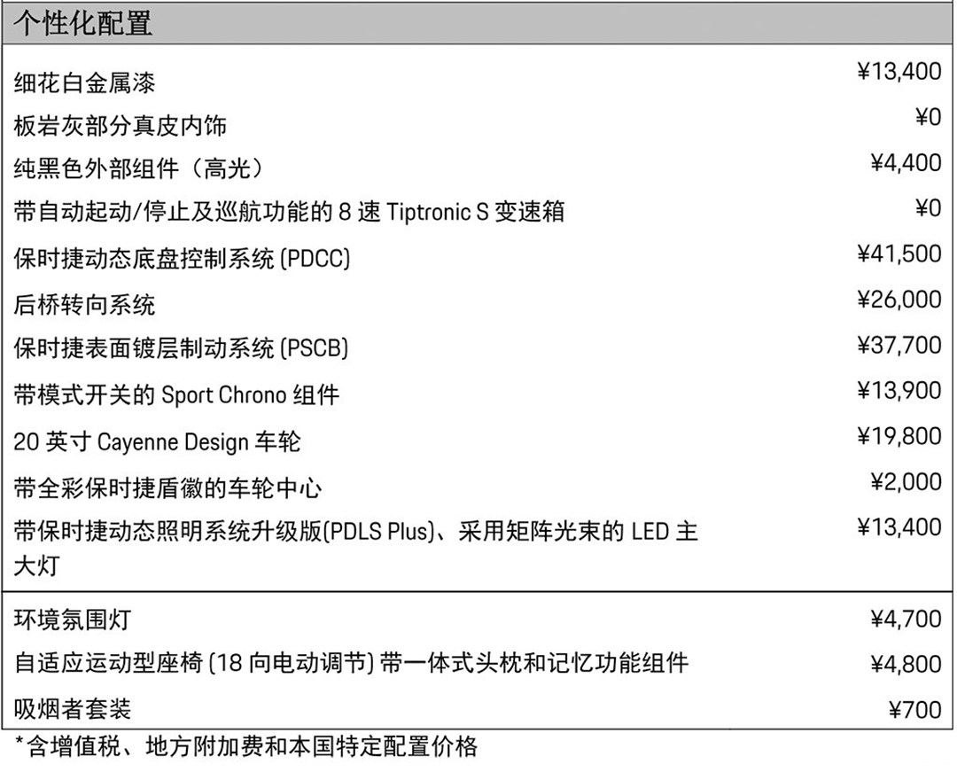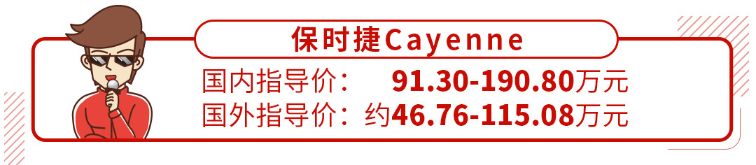 在售价定价层面,国内和海外版本保时捷Cayenne大不相同,在国内起步价91.30万元,而海外起步价仅需要46.76万元。而且,在进入国内市场后,保时捷Cayenne在动力、配置等多个方面都有一定的变化。但不管国内还是国外,Cayenne配置仍是以选装为主,譬如后桥限滑差速锁、前座椅按摩功能、整体主动转向系统这些均要选装。