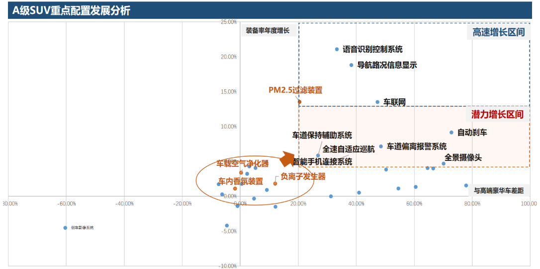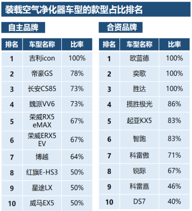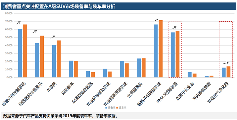 据中汽研的统计数据,A级SUV中有51款配备了空气净化装置,可能有人会为空气净化装置这个叫法感到好奇?其实就是配备比PM2.5的更好的空调滤,或在此基础上增加负离子发生器。车载空气净化器应该会成为今年新车一大宣传亮点,换而言之,今年的新车大部分都会配备。