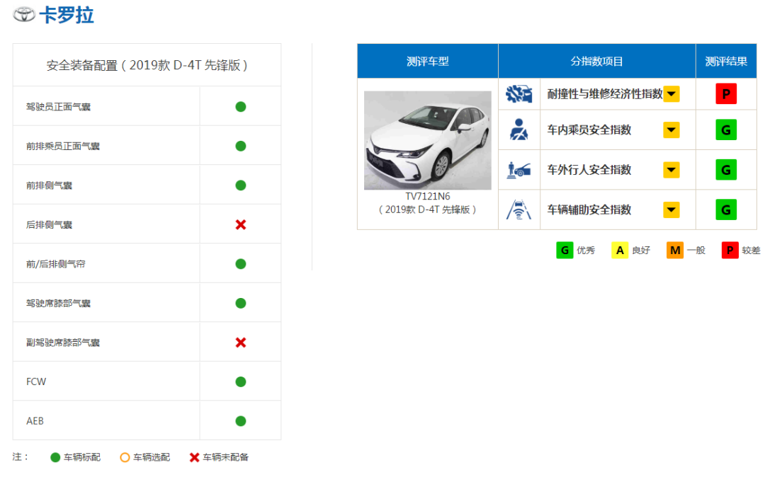 首先现在产自TNGA架构下的车型在安全方面确实有了很大提升,卡罗拉也不例外。以现在国内消费者普遍信任的中保研测试结果为例,车辆在碰撞时车内成员安全指数、车外行人安全指数以及车辆辅助安全指数均达到G(优秀)。10安全气囊、主动刹车等全系标配的安全配置以及更高强度的车身结构确实比起老款车型有非常大的提升。